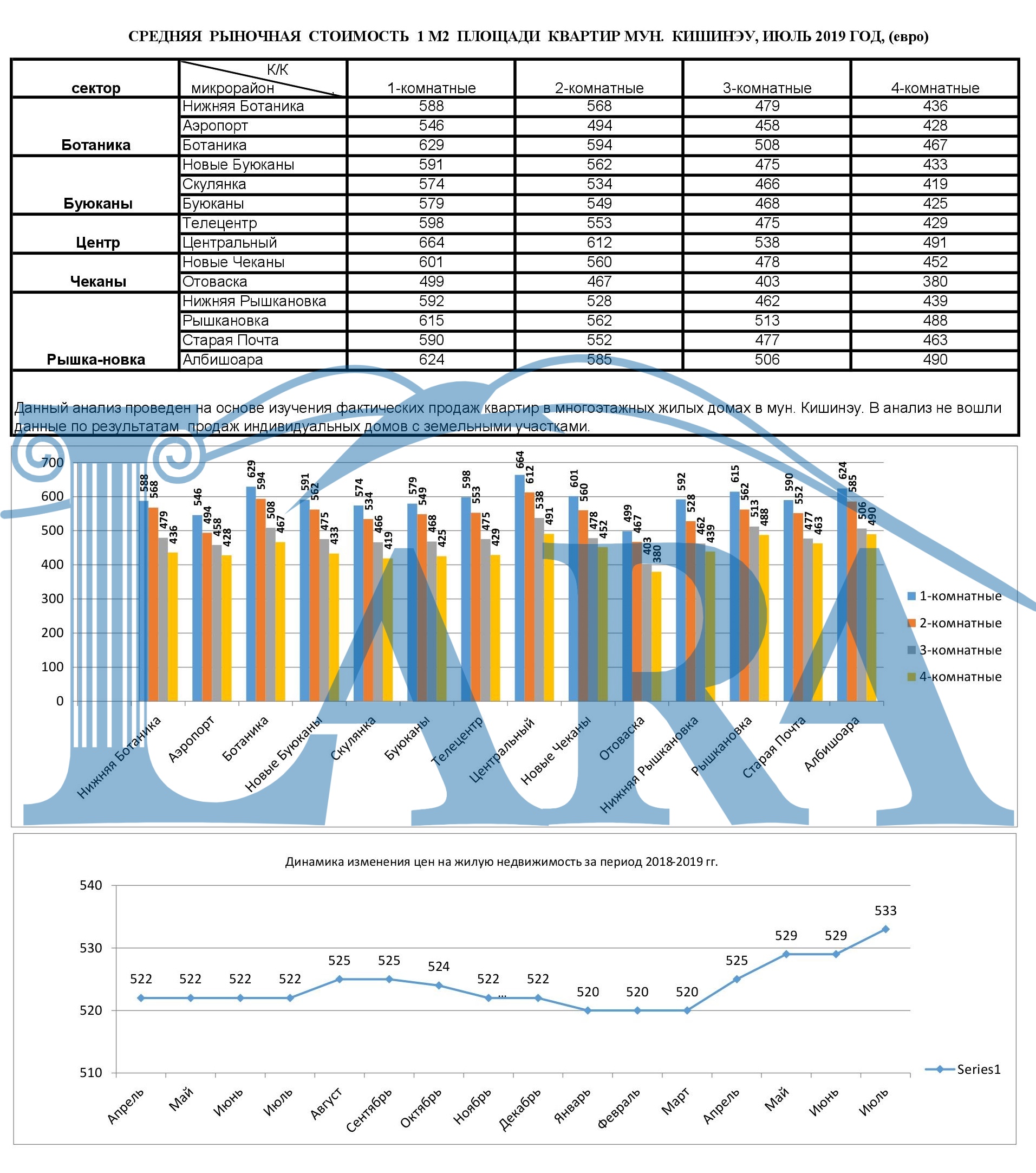 CРЕДНЯЯ РЫНОЧНАЯ СТОИМОСТЬ 1 М2 ПЛОЩАДИ КВАРТИР МУН. КИШИНЭУ, ИЮЛЬ 2019 ГОД, (евро)