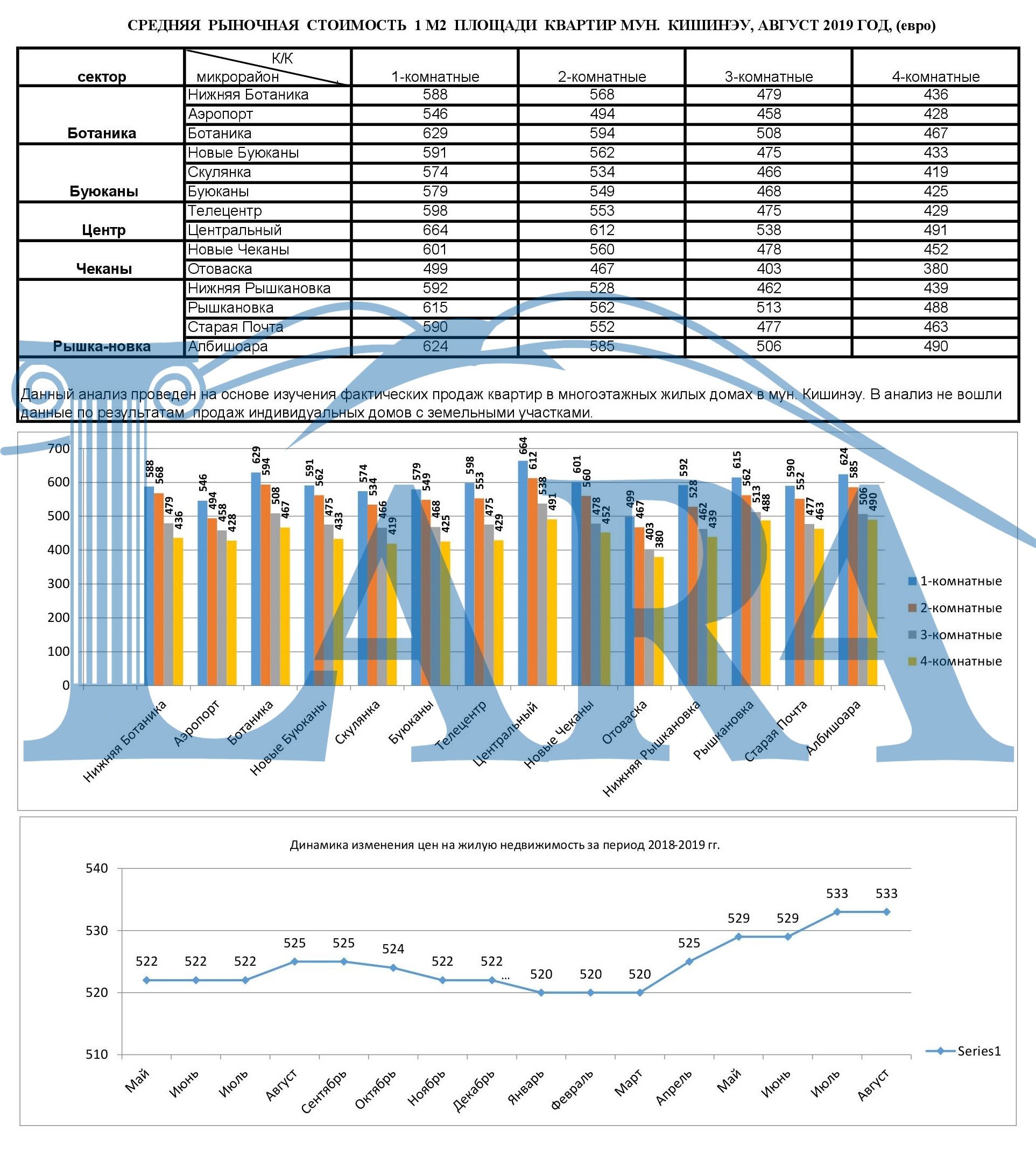CРЕДНЯЯ РЫНОЧНАЯ СТОИМОСТЬ 1 М2 ПЛОЩАДИ КВАРТИР МУН. КИШИНЭУ, АВГУСТ 2019 ГОД, (евро)