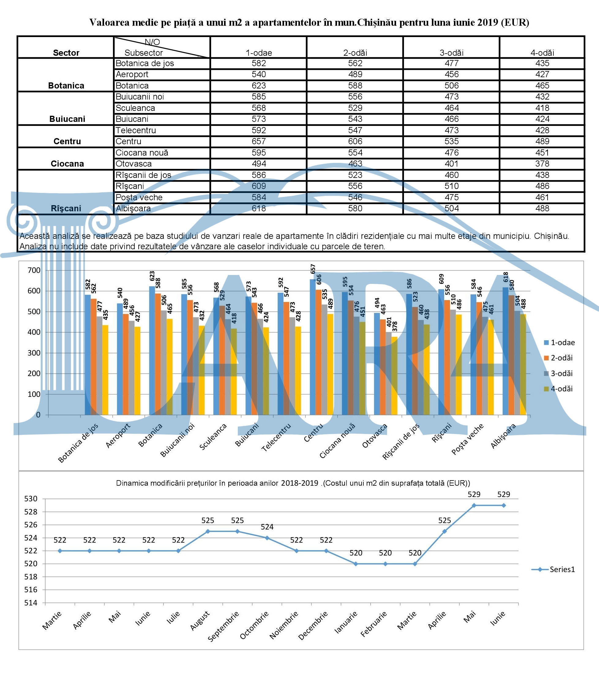 Valoarea medie pe piaţă a unui m2 a apartamentelor în mun.Chişinău pentru luna iunie 2019 (EUR)