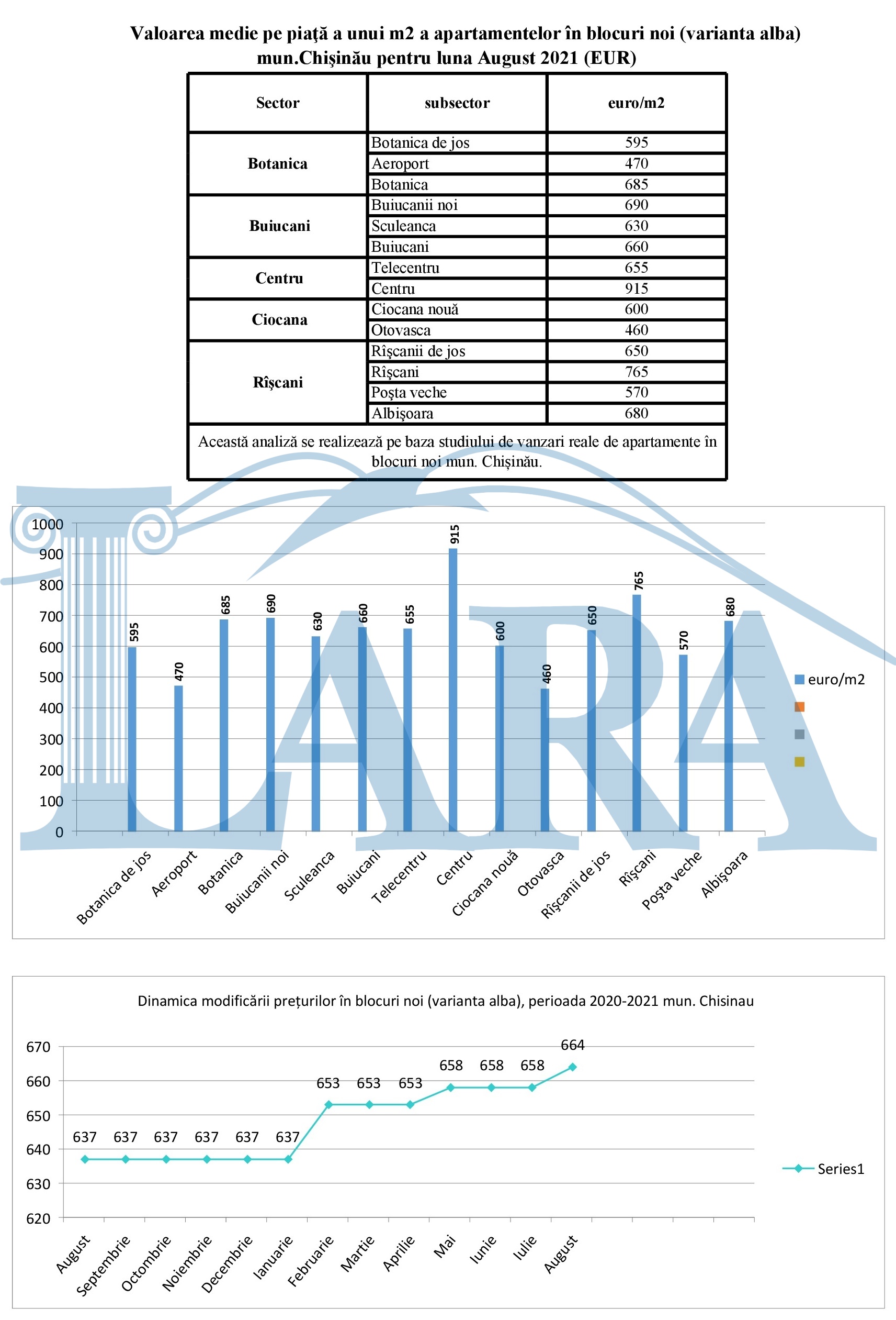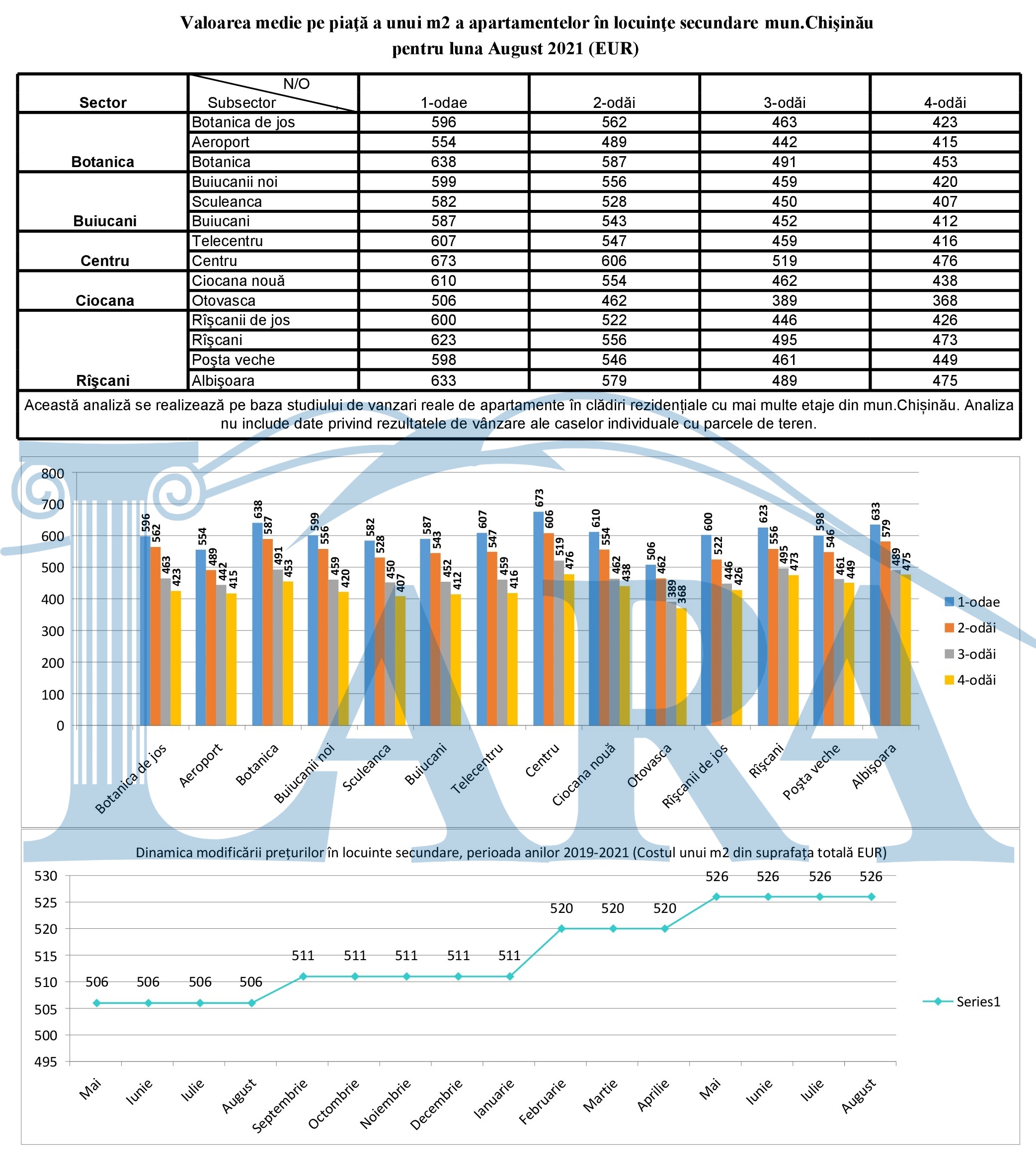 Valoarea medie pe piaţă a unui m2 a apartamentelor în mun.Chişinău pentru luna august 2021 (EUR)