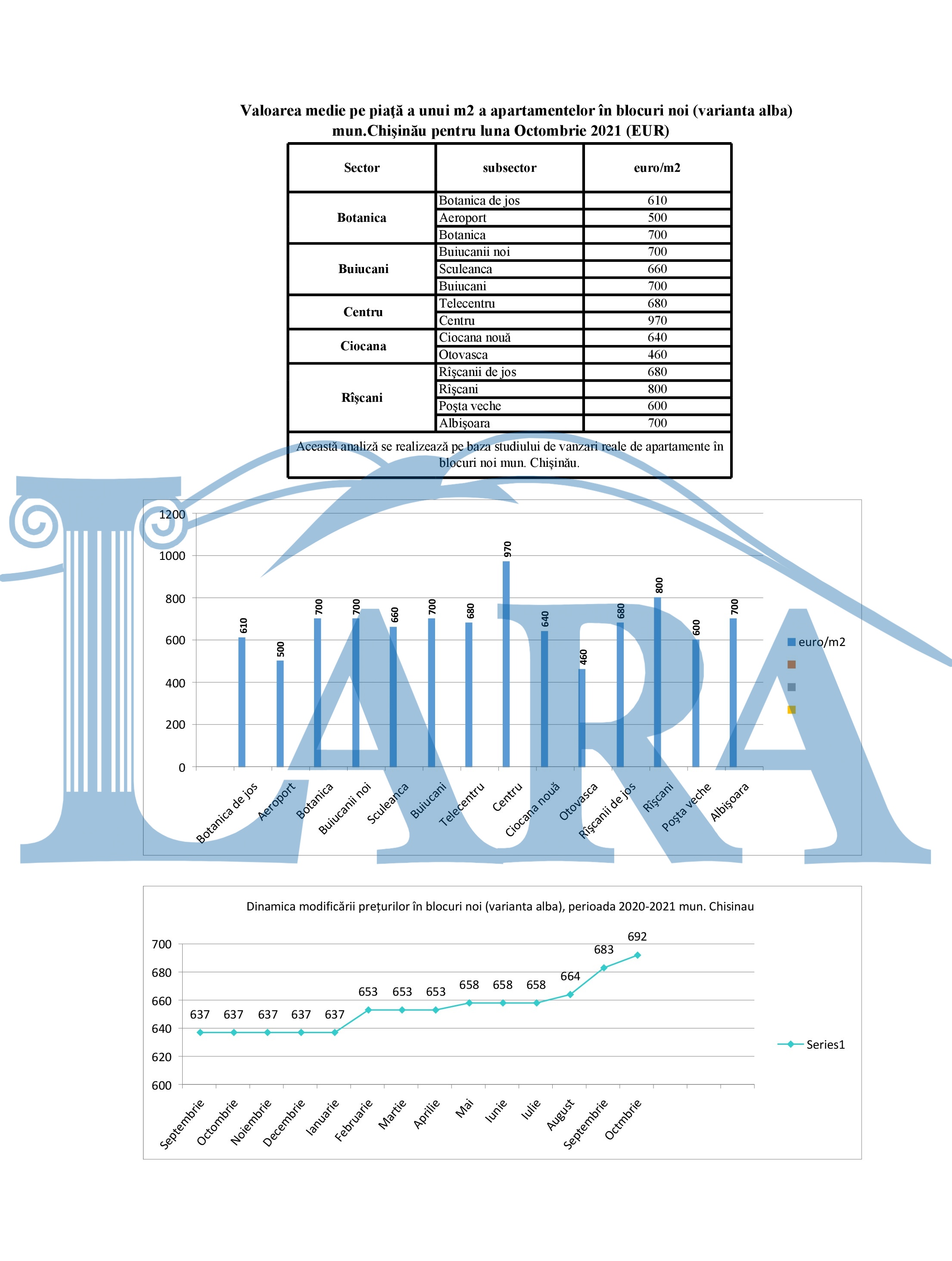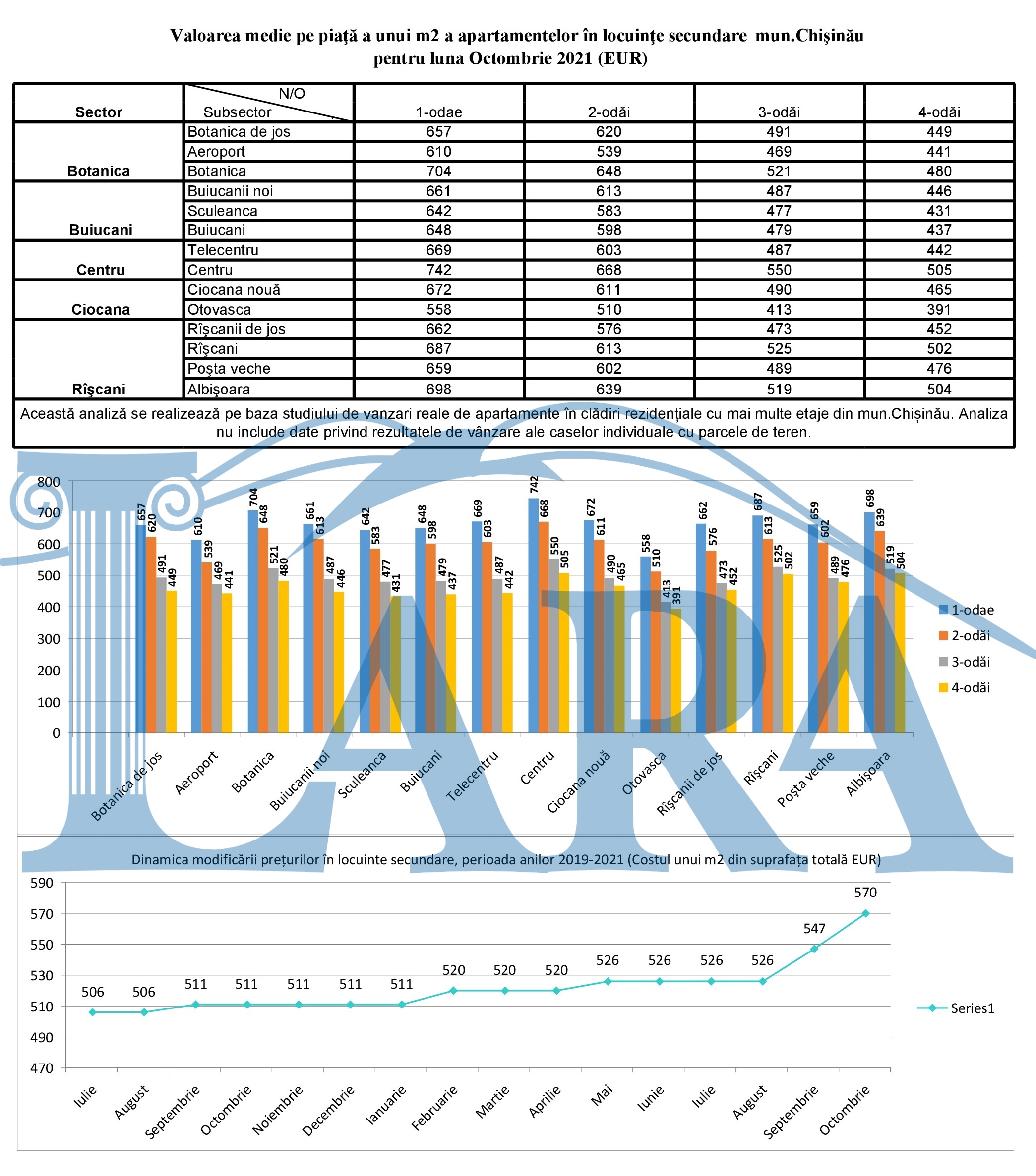 Valoarea medie pe piaţă a unui m2 a apartamentelor în mun.Chişinău pentru luna octombrie 2021 (EUR)