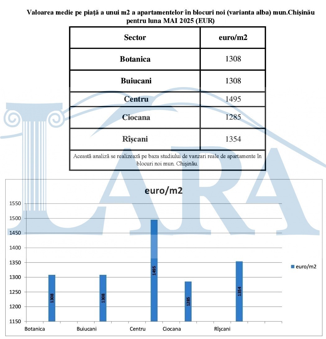 Valoarea medie pe piaţă a unui m2 a apartamentelor în mun.Chişinău pentru luna MAI 2025 (EUR)
