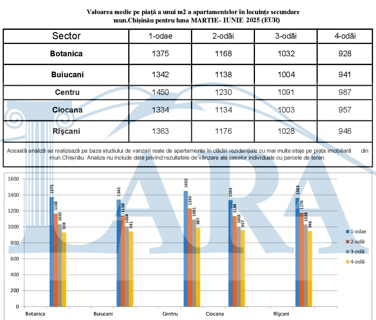 Conform datelor companiei noastre, Bursa Imobiliară „LARA”, prețul unui metru pătrat de apartament pe piața secundară din Chișinău mun. în perioada martie-iunie 2025 este prezentat mai jos: