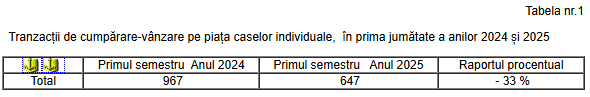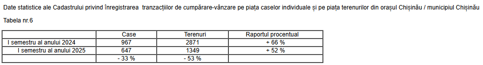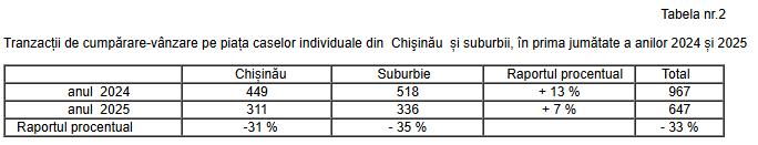 Conform datelor Cadastrului, în prima jumătate a anului 2025, au fost încheiate 647 tranzacții de cumpărare-vânzare de case individuale în vun.Chișinău și în suburbii, cu 33% mai puțin față de anul 2024 (967 tranzacții de cumpărare-vânzare). Una dintre cauzele reducerii tranzacțiilor este scăderea cererii pentru case individuale la prețuri supraevaluate și speranța cumpărătorilor că prețurile vor fi ajustate.