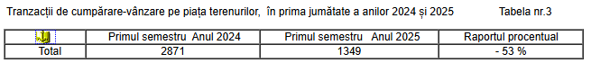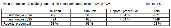Conform datelor Cadastrului, în prima jumătate a anului curent, au fost încheiate 1349 tranzacții de cumpărare-vânzare pe piața terenurilor din mun.Chișinău și din suburbii, cu 53% mai puțin față de anul 2024 (2871 tranzacții de cumpărare-vânzare). Scăderea tranzacțiilor de cumpărare-vânzare pe piața terenurilor s-a produs în mod proporțional, atât în oraș, cât și în suburbii.