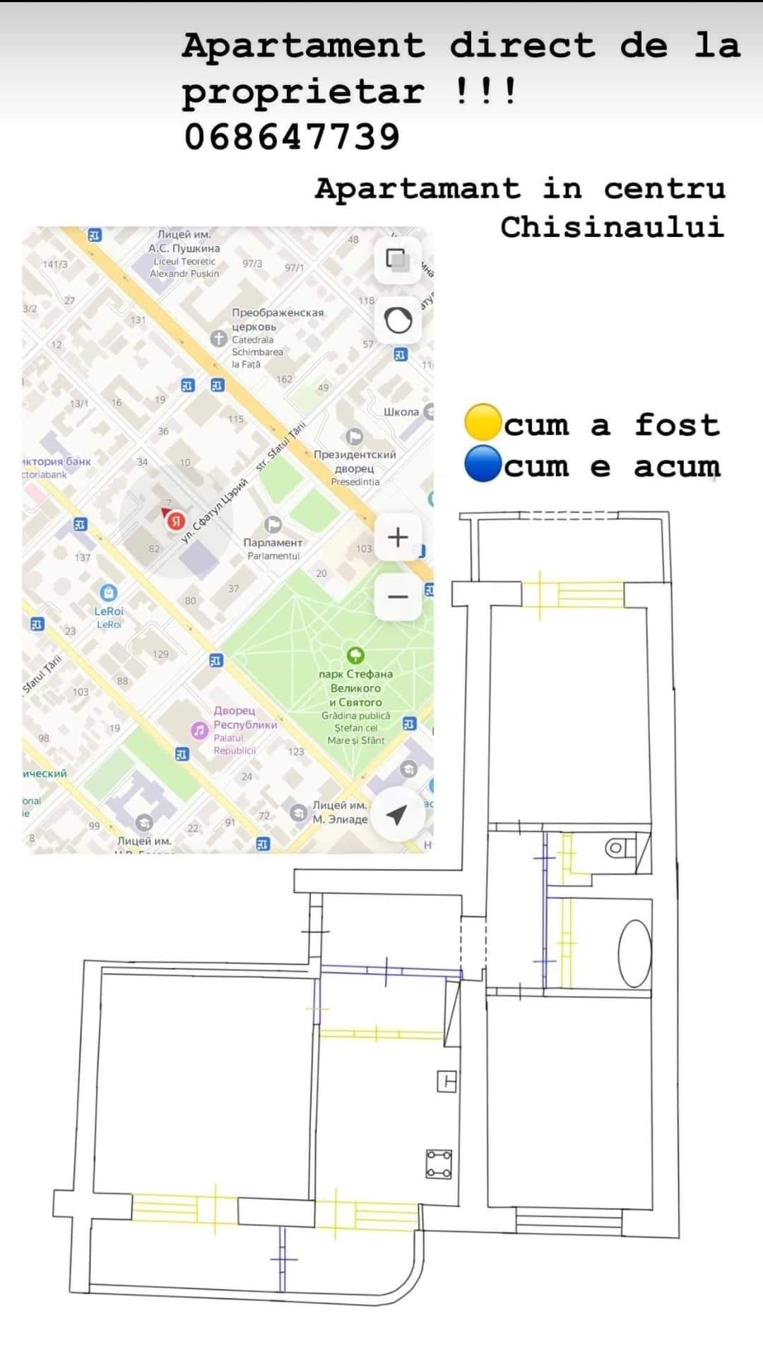 Apartament cu 3 odai separate bilateral amplasat in centrul orasului Chisinau Centru str. A.Corobceanu 1B !!!!! DIRECT DE LA PROPRIETAR !!!!! 068647739 La doar citiva metri de Gradina publica Stefan cel Mare o zona linistita. Apartamentul este in varianta alba, sunt trase toate comunicatiile, electricitatea, aragaz si apa, 2 blocuri sanitare cu reparatie, debara, incalzire centralizata. Geamuri termopane cu 7 camere si 3 rinduri de sticla, Usa blindata de calitate inalta. Toata electricitatea in apartament a fost schimbata. Casa este construita din cotileti, grosimea paretilor este de 60cm, apartamentul este foarte calduros. In apropiere se afla: *Scoala *Gradinita *Farmacie *Parlamentul Republicii Moldova *Teatrul Ginta Latina *Ministerul de justitie Pretul: 144999€ Apartament in centru orasului Apartament cu 3 odai separate