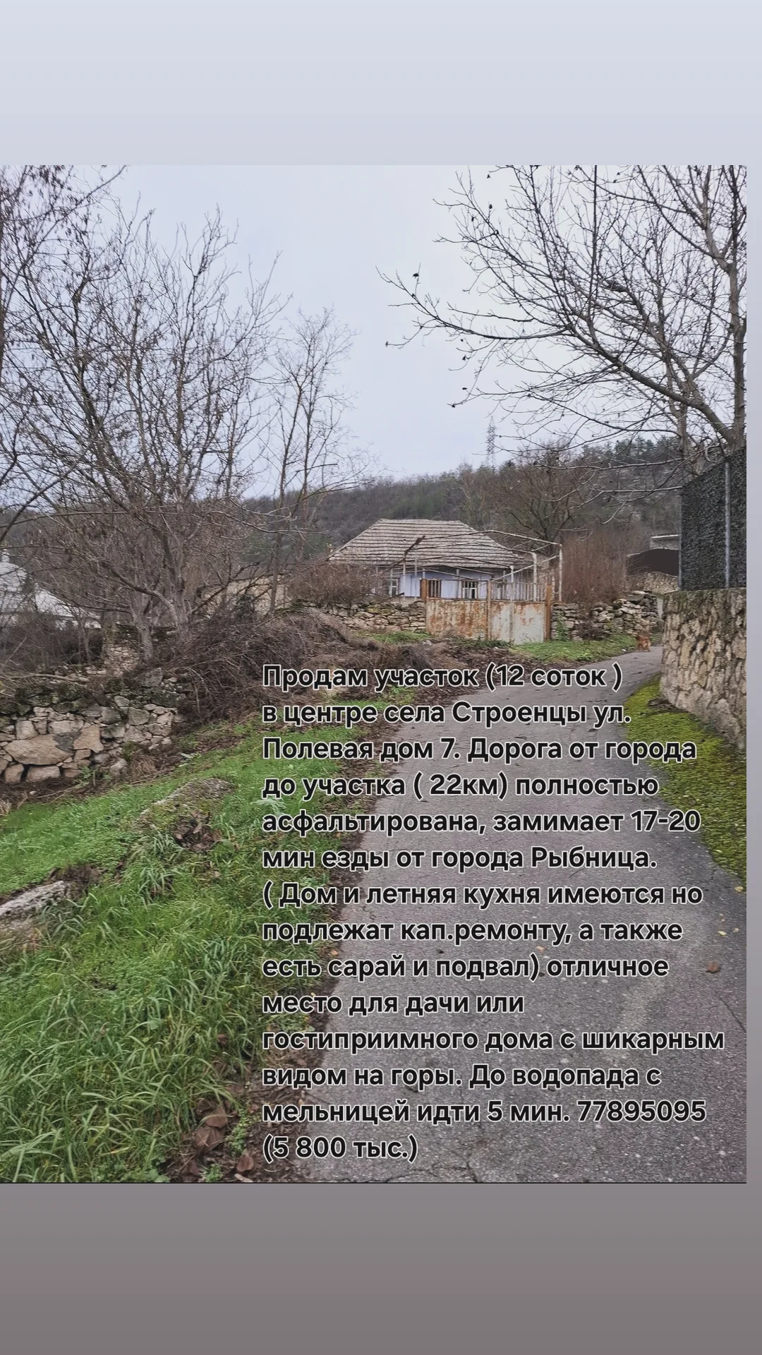 Продам участок (12 соток ) в центре села Строенцы ул. Полевая дом 7. Дорога от города до участка ( 22км) полностью асфальтирована, замимает 17-20 мин езды от города Рыбница. ( Дом и летняя кухня имеются но подлежат кап.ремонту, а также есть сарай и подвал) отличное место для дачи или гостиприимного дома с шикарным видом на горы. До водопада с мельницей идти 5 мин.