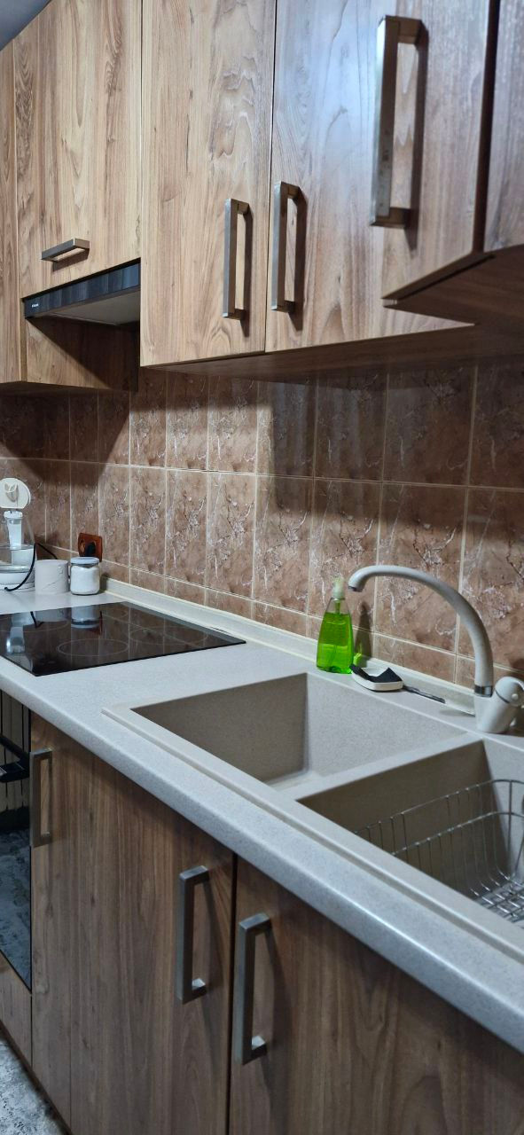На кухне современная мебель, раковина с двумя чашами, встроенный электрический бойлер на 10л,